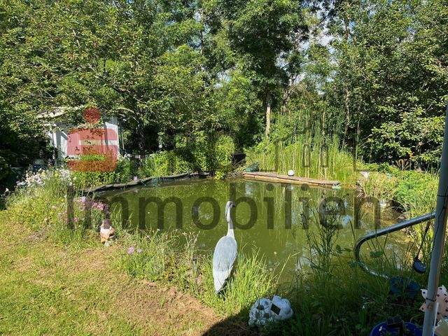 Großer Garten mit Teich und Nutzgarten für die Wohneinheit sowie einer Hoffläche für die Gewerbeeinheit.